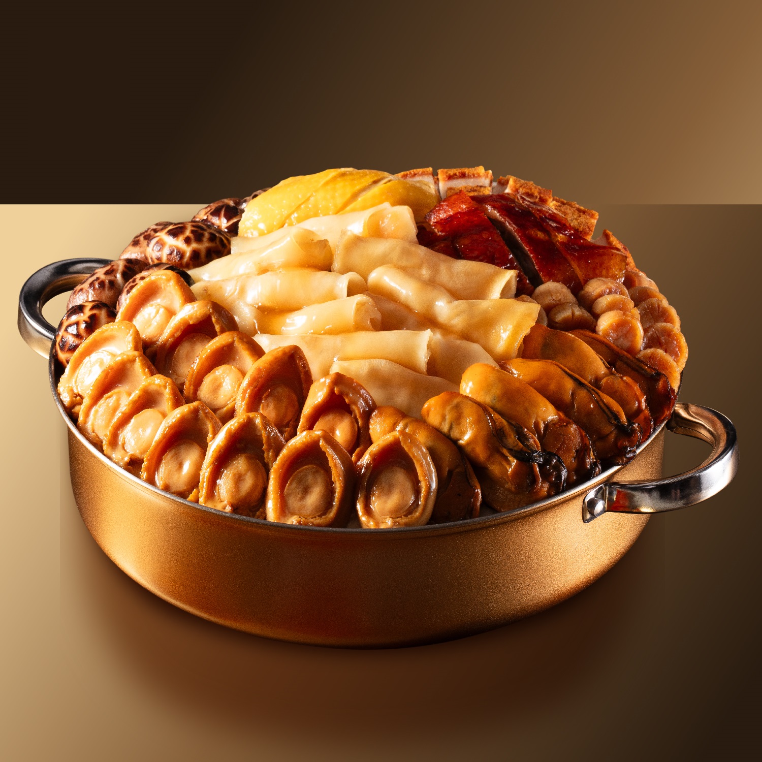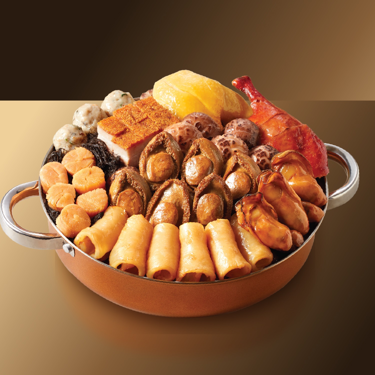 原隻鮮鮑魚、特級蠔豉、元貝、貴妃雞、燒鴨、大紅燒肉、墨魚乾炆豬肉、鮑魚汁炆花膠、醬汁炆蓮藕、髮菜球、香滑鯪魚球、雞油花菇、滷水豬脷、南乳花生炆豬手、豬皮、枝竹
