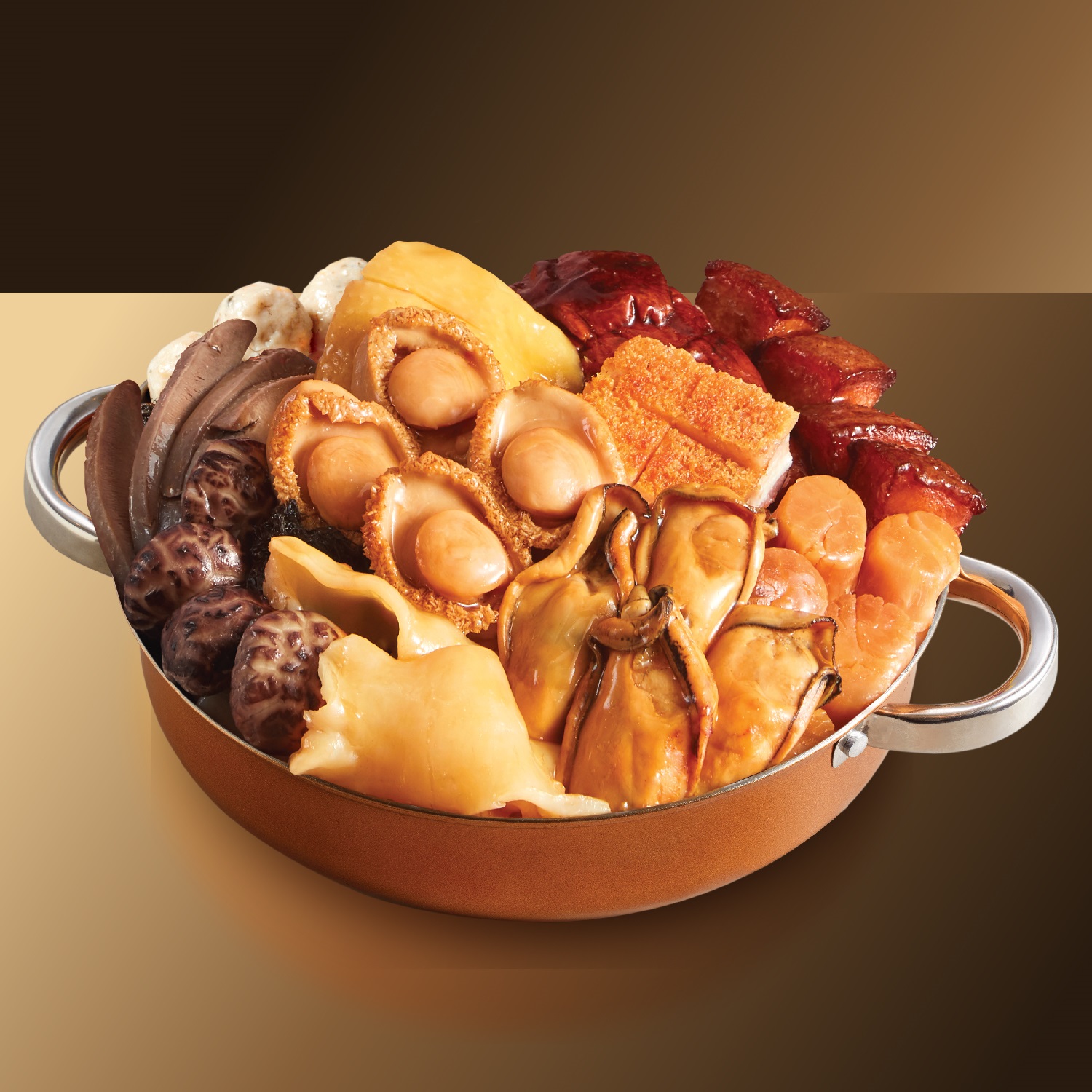 原隻鮮鮑魚、特級蠔豉、元貝、貴妃雞、燒鴨、大紅燒肉、墨魚乾炆豬肉、鮑魚汁炆花膠、醬汁炆蓮藕、髮菜球、香滑鯪魚球、雞油花菇、滷水豬脷、南乳花生炆豬手、豬皮、枝竹