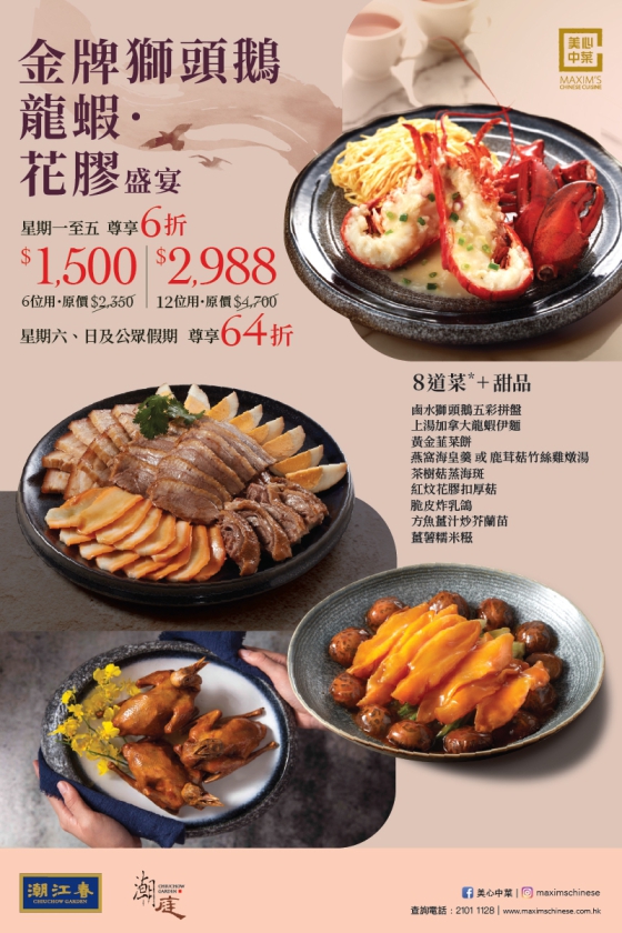 *12位菜價包括橙汁兩酌或大啤酒兩支;6位菜價包括橙汁乙酌或大啤酒乙支;須另收茶位費、加一服務費及前菜費