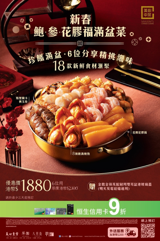 圍坐團圓,一起豐衣足食;擺得滿滿,正因「盆滿缽滿」!黃金玉參、飽滿鮑魚、名貴花膠、帶子鮮蝦,盡是上等海中食材;配上傳統南乳汁烹調,更能提升海鮮味道,濃郁而不覺膩。講究的擺位,令矜貴鮮味層層相連,盡收黃金精華。共度佳節時,就以金匙金筷,分享貴氣騰騰的美味祝福。