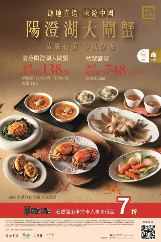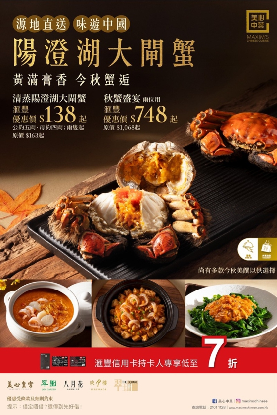 美心中菜「以質為根」,由總廚遠赴江蘇陽澄湖,嚴選湖內優質生猛的大閘蟹,每隻陽澄湖大閘蟹更有原產地紅標防偽蟹扣,保證來自湖心養殖區;直送香港後以精湛的烹調技藝,將肥美靚蟹化作一道道精巧粵菜。當中一絕的蟹粉,以小慢火迫出鮮香,火熱中再以薑米黃酒入饌辟腥,繼而以鎮江醋提鮮,令鮮甜濃郁爆發,是蟹迷必嚐的第一鮮。