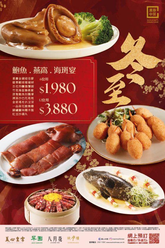 美心中菜冬至套餐現已推出!「鮑魚.燕窩.海斑宴」可供6位或12位享用,適用於粵菜分店。歡迎親臨分店預訂 或 於11月21日起於網上訂購。