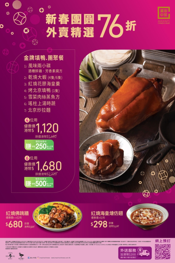 美心中菜潮式新春團圓外賣套餐現已推出!分別提供4位或6位享用,適用於美中鴨子及城中鴨子分店。歡迎親臨分店預訂或於網上訂購。