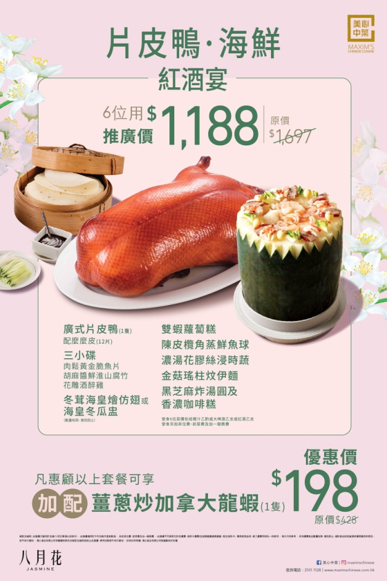 以上套餐只適用於午市及晚市之堂食散座(不包括廳房)| 停用日期恕不另行通知 |另收加一服務費、茶位費及前菜費 | 優惠受條款及細則約束|如有任何爭議,美心食品將保留最終決定權|所有圖片只作參考,敬請預先訂座,詳情請向店員查詢